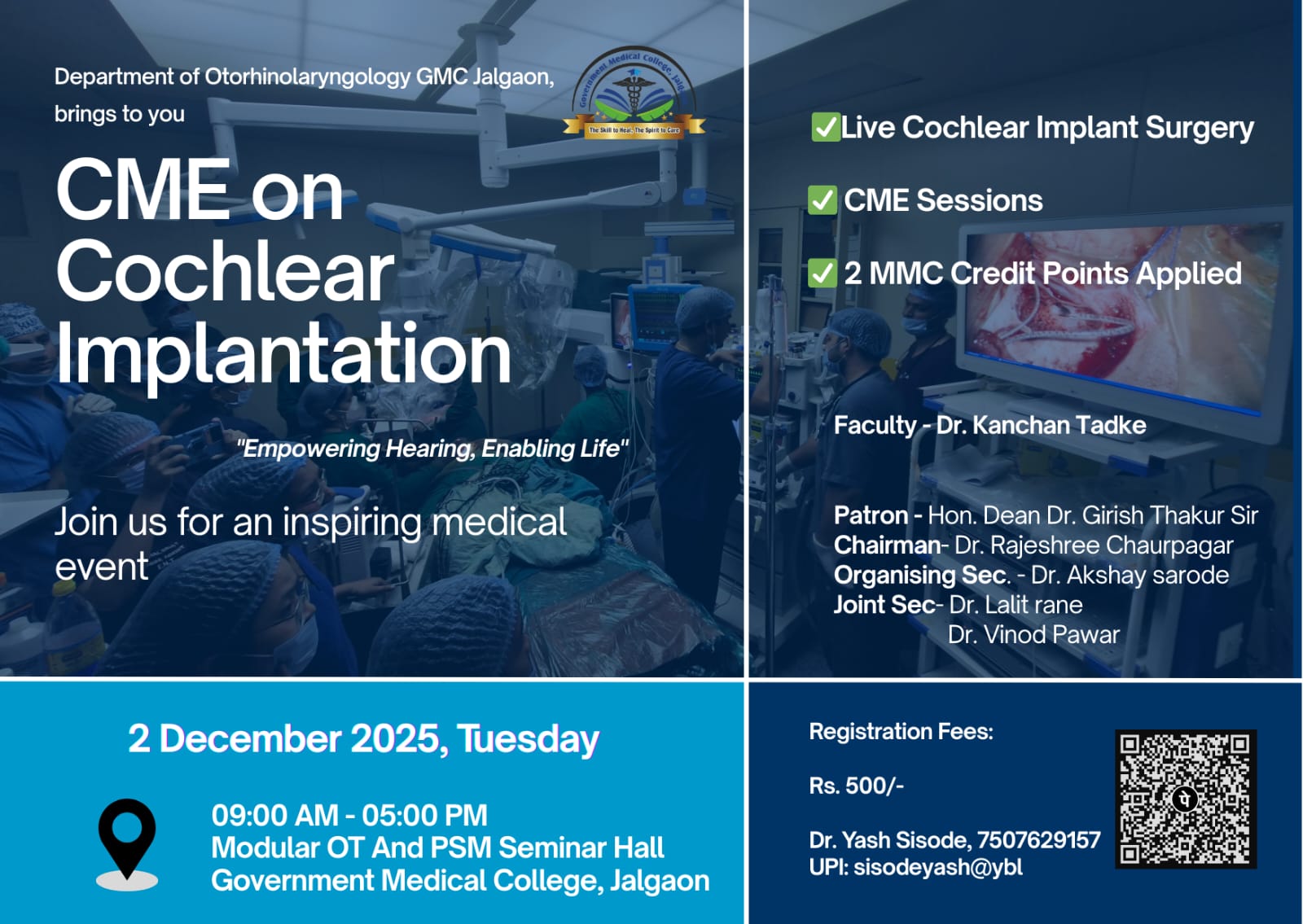 The Department of Otorhinolaryngology, Government Medical College, Jalgaon conducted a Live Surgical Workshop and Continuing Medical Education (CME) on Cochlear Implantation on 2nd December 2025. This programme featured the second successful cochlear implant surgery performed at GMC Jalgaon, highlighting the institute’s growing expertise in advanced otologic procedures.
